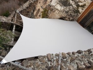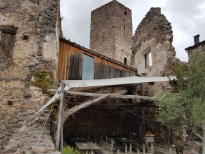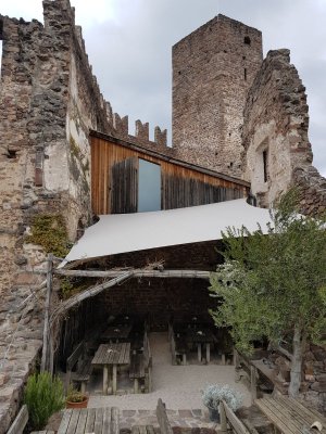 Segel im Innenhof auf Schloss Hocheppan. Geschichte mit Moderne in Kombination...