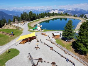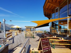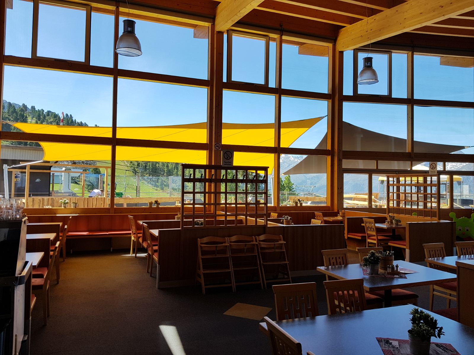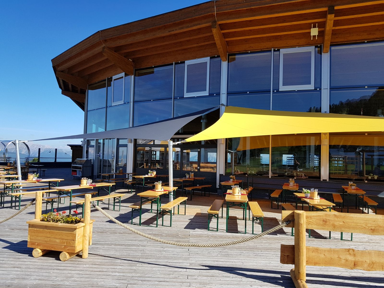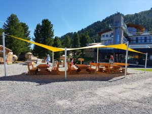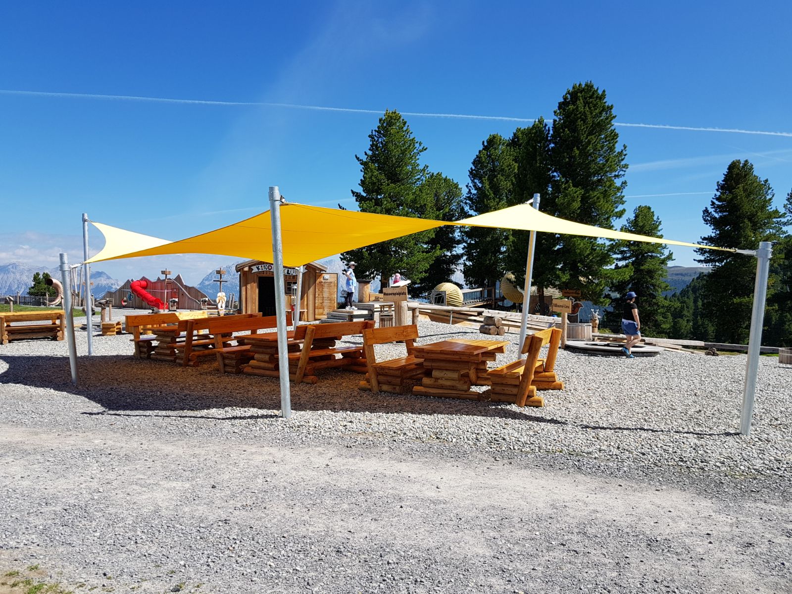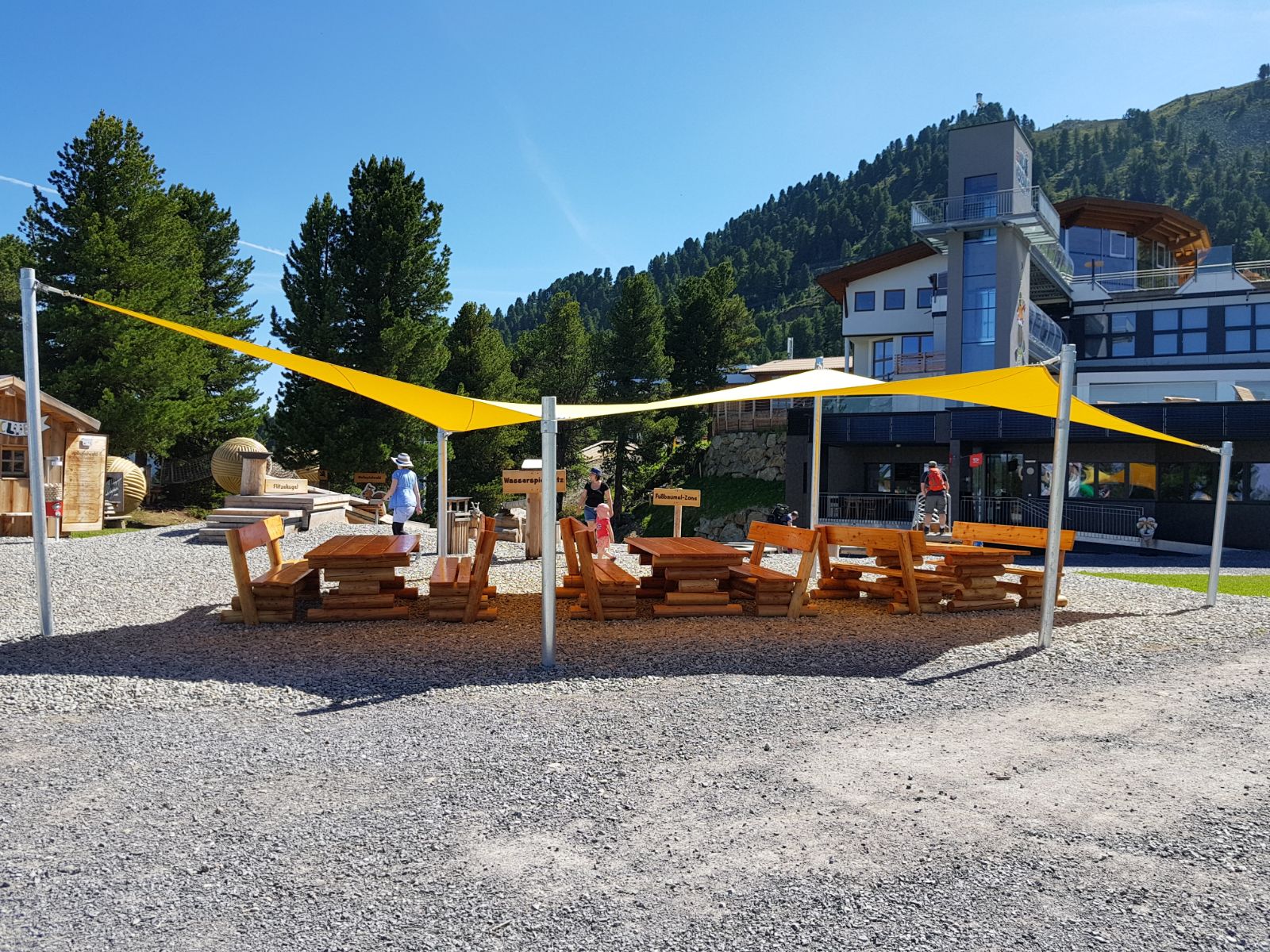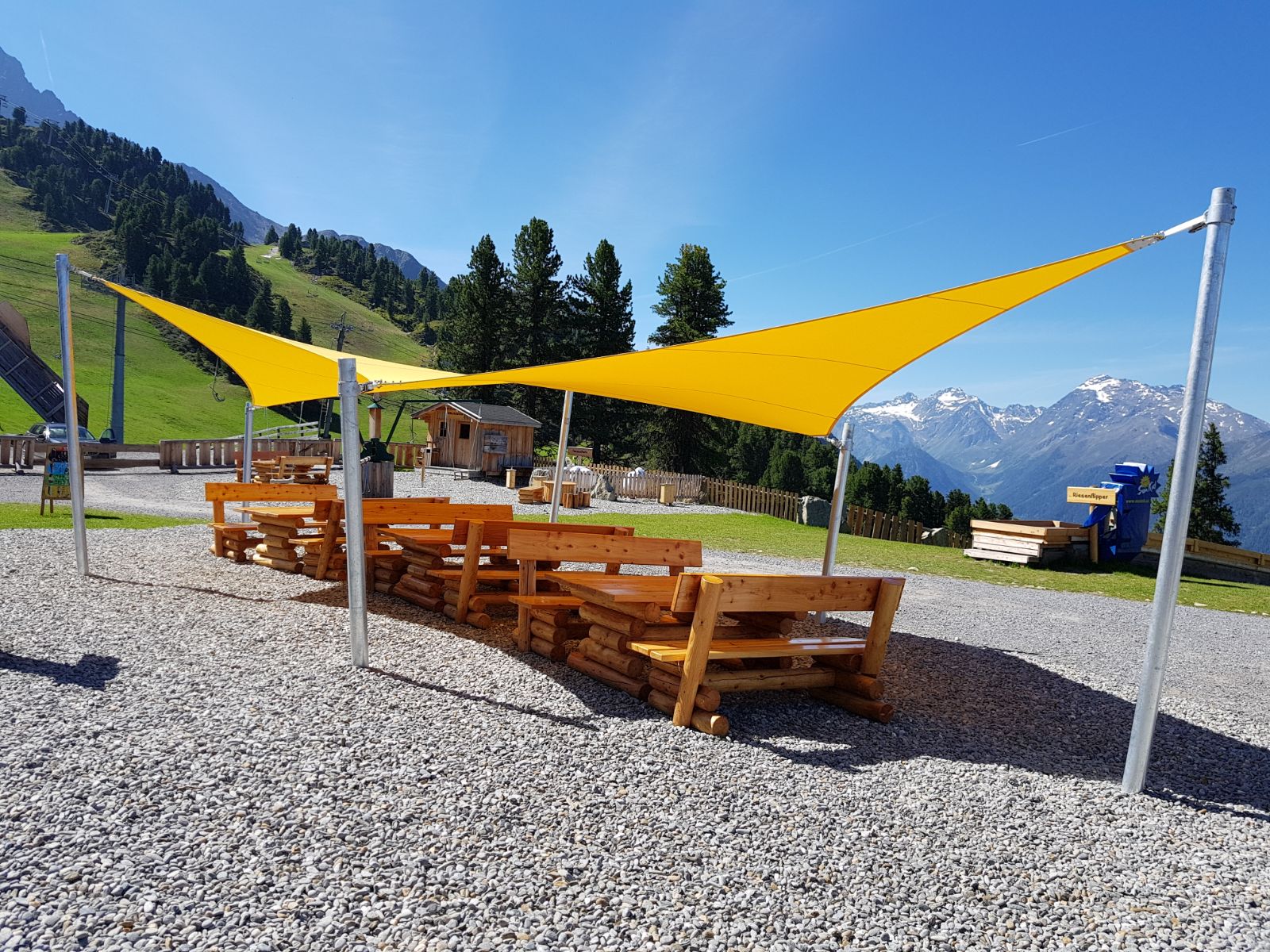 Ein Segel auf über 1800 m... Freistehender Schattenspender für den Spielplatz mit ca. 60m2 und ein Sonnenschutz an der Terrasse des Panoramarestaurant Hochötz.