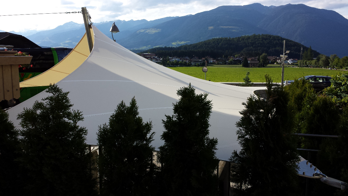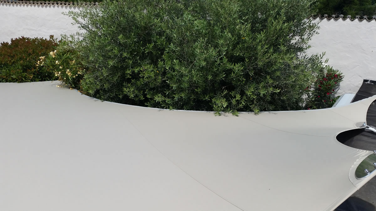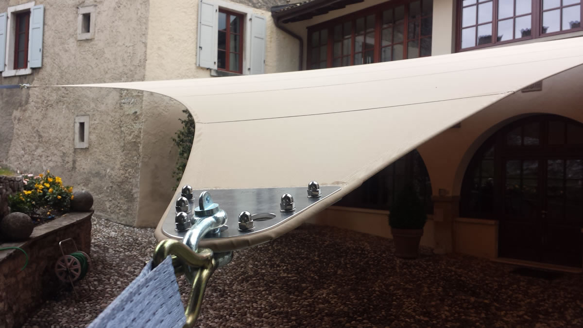 Die spezielle Verarbeitung des Stoffes mit konkav geformten Seitenränder und die mit Klemmplatten verstärkten Eckausbildungen halten Windbelastungen bis zur Stärke 8 stand. Die Verankerung des Segels kann an der Mauer, über freistehende Säulen mit Fundament oder Sonderlösung der Säulen erfolgen. Damit die Kräfte gleichmäßig in die Fläche eingeleitet werden, ist ein umlaufendes Stahlseil eingearbeitet, jede Ecke mehrlagig verstärkt und mit ALU - Klemmplatten, -Ovalen, -Ronden oder Segel - Spezialösen versehen. Sobald das Segel an den Ankerpunkten mit Spanngurte, Wantenspanner oder Sonderspannelemente (bis zu 500kg pro Abspannpunkt) beaufschlagt wird, spannen die Innenbögen das Segelmaterial gleichmäßig und faltenfrei aus.