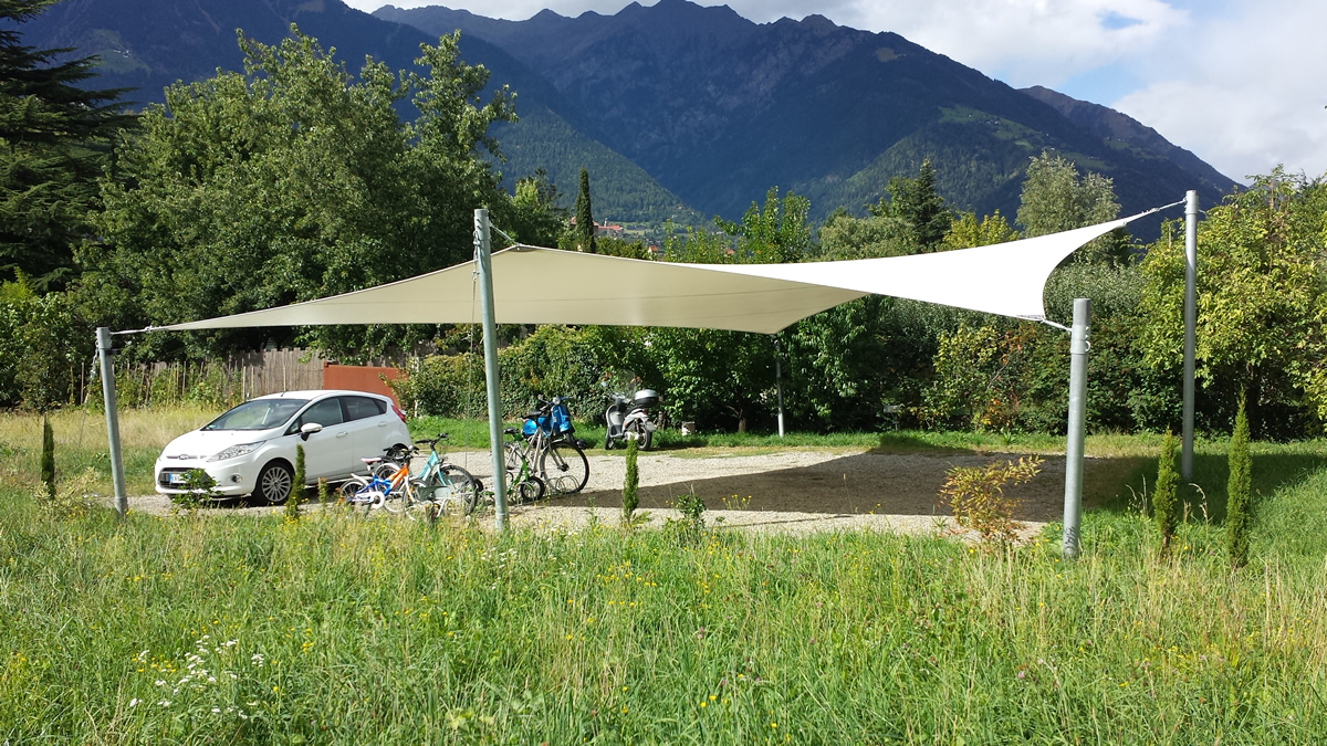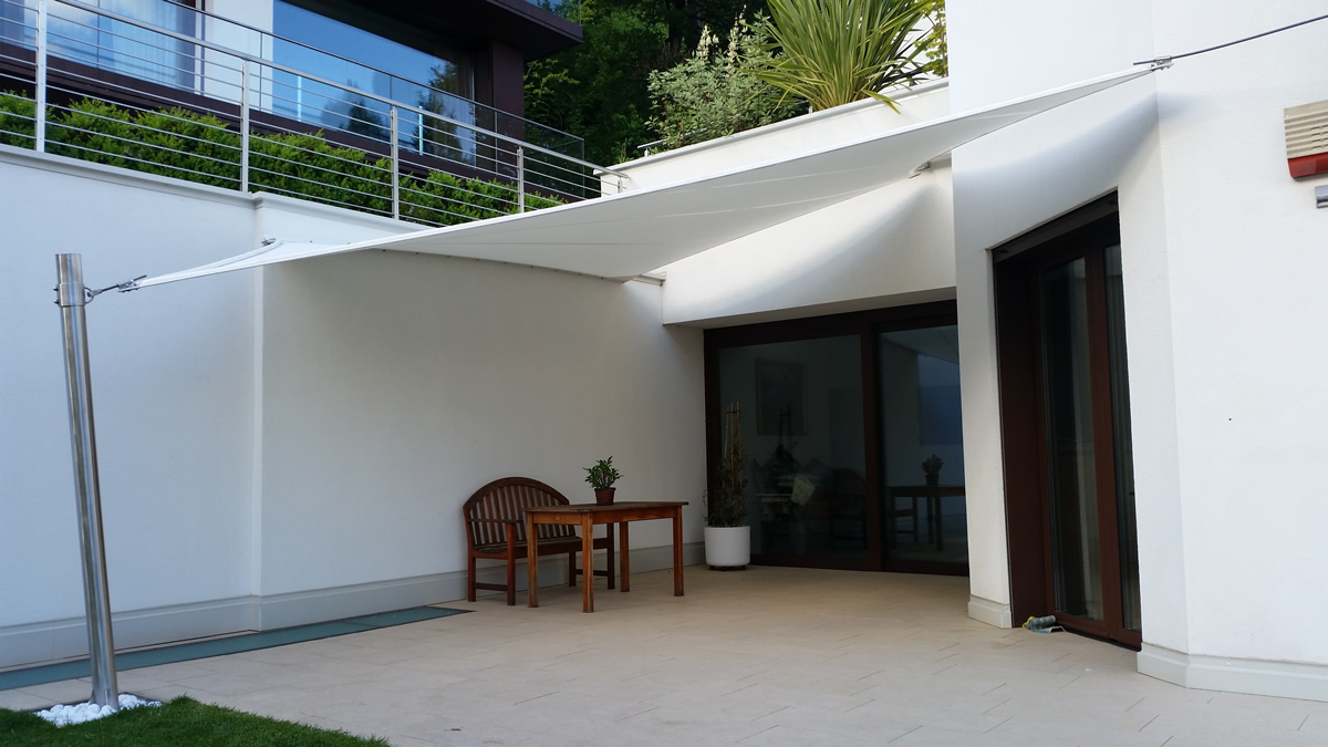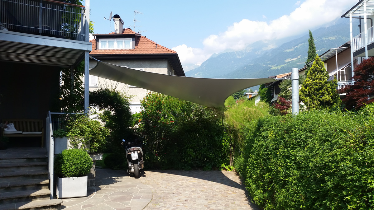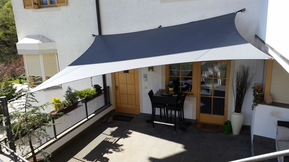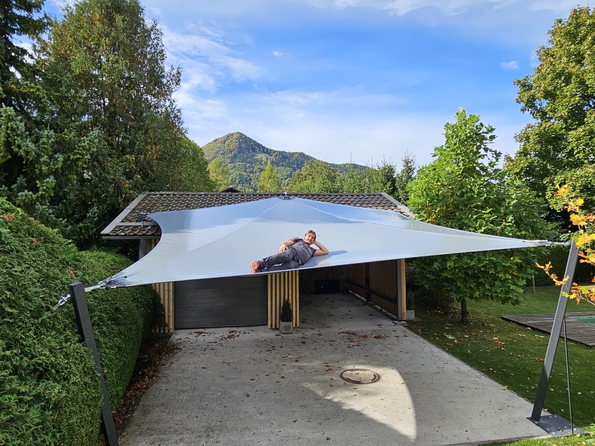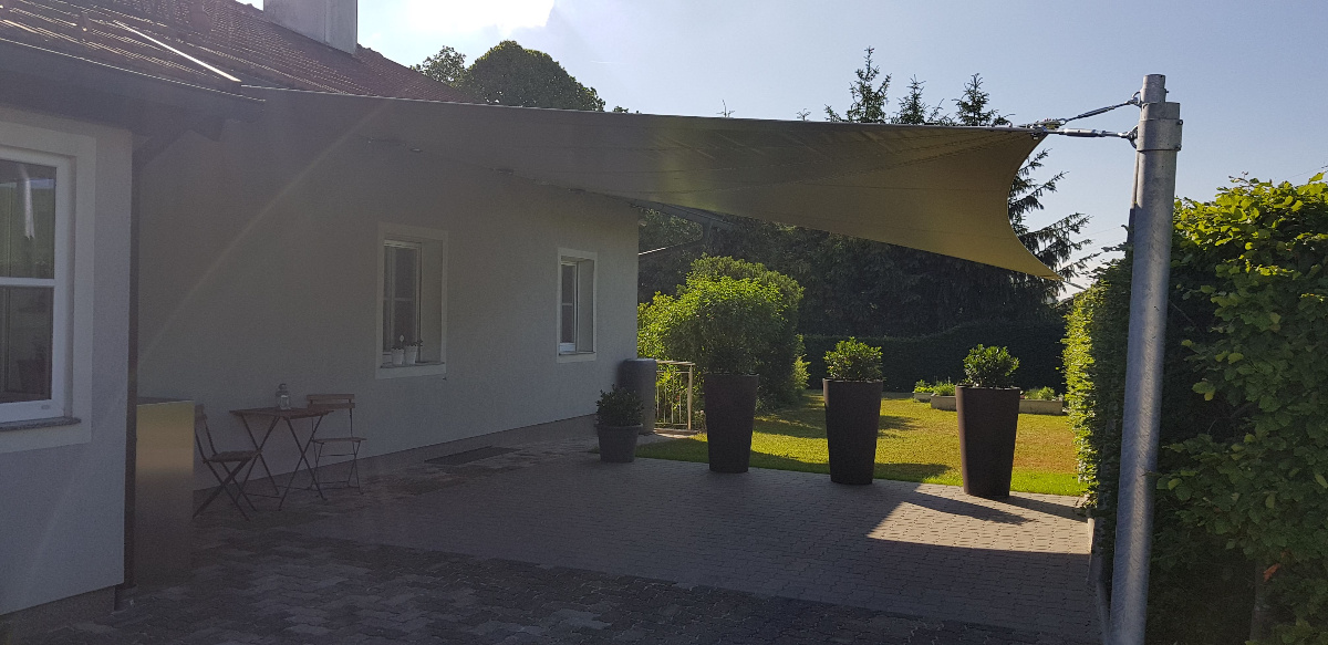 Sonnensegel-Anlagen für den ganzjährigen Einsatz bei Wind und Wetter. Textiler Mambranbau oder auch textile Architektur genannt. Dauerhafter Nutzen in Form architektonischer Highlights zur Beschattung, als Regen- und Schneeschutz. An oder auf Gebäuden oder freistehend als Solitair. In Gärten, als Vordach, als Carport oder sonst als Überdachung. Privat, gewerblich, in Kitas und für die Gastronomie.