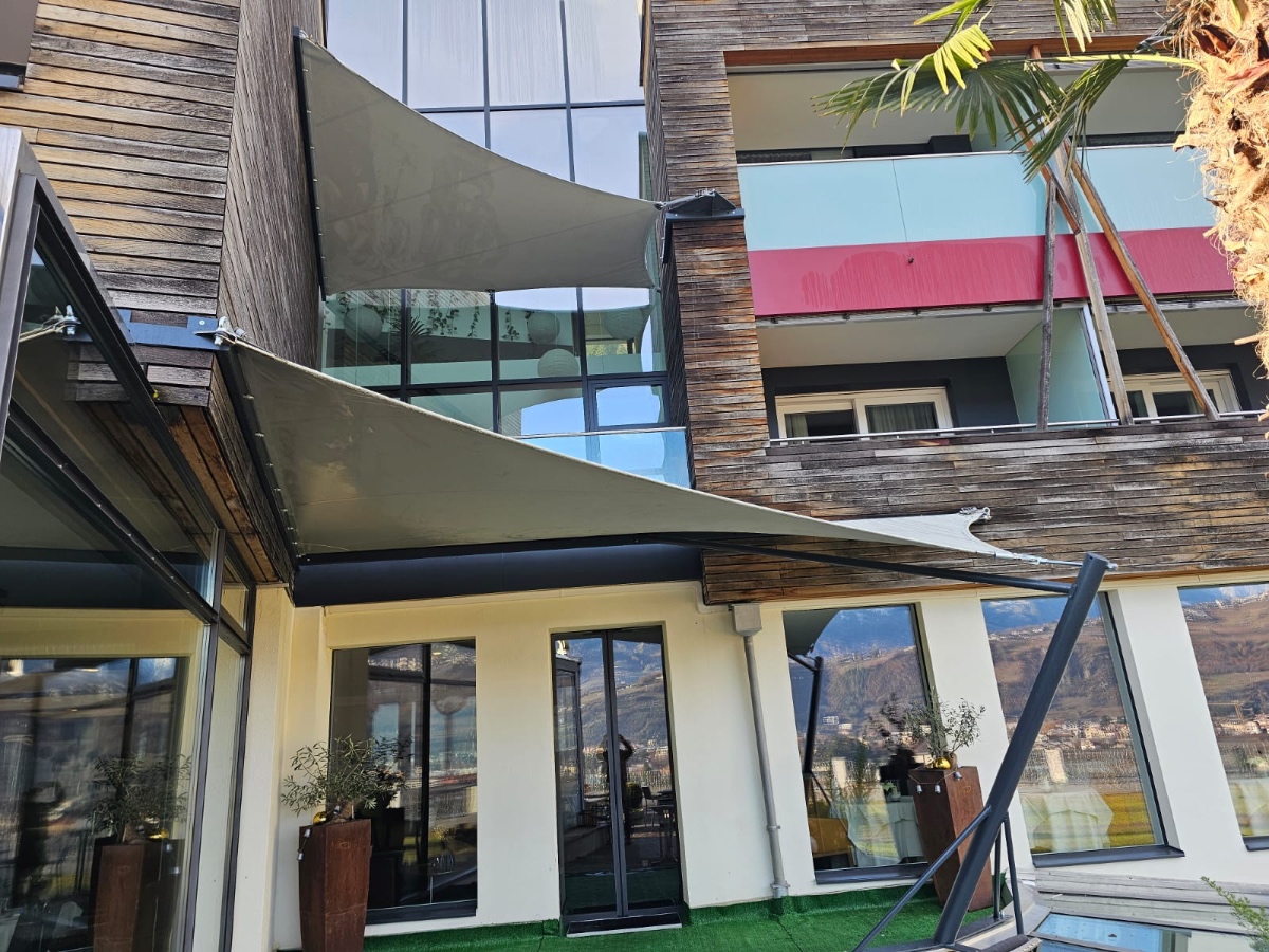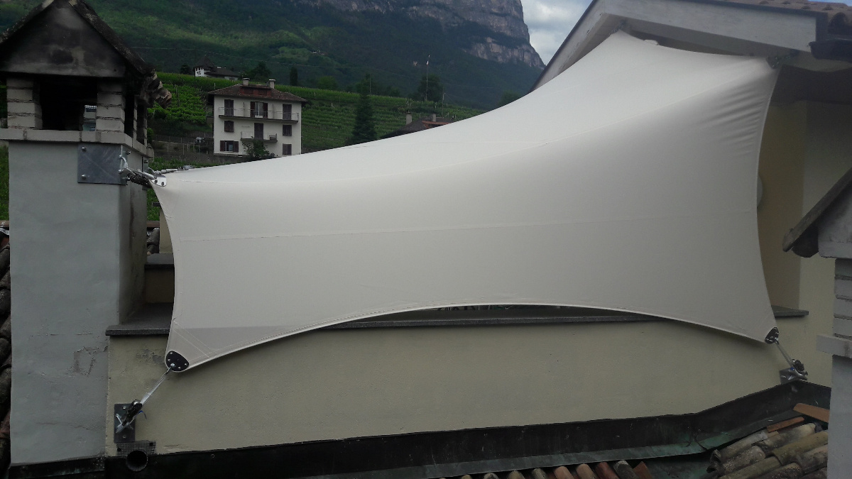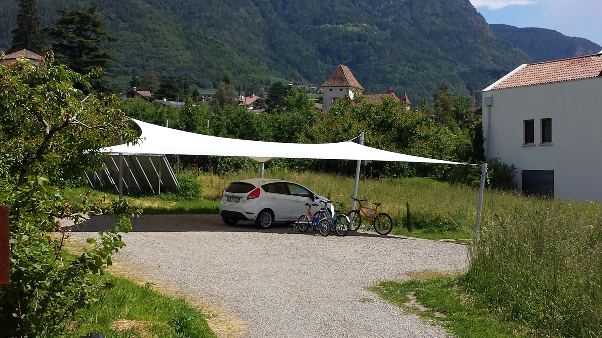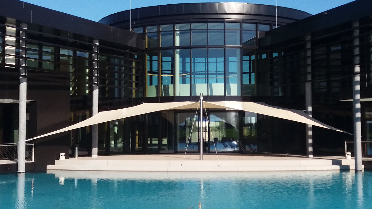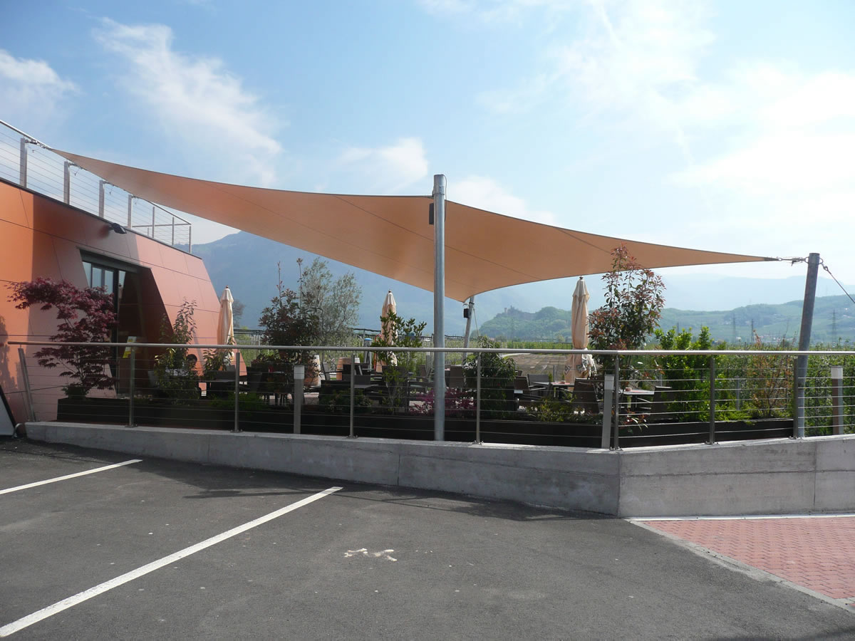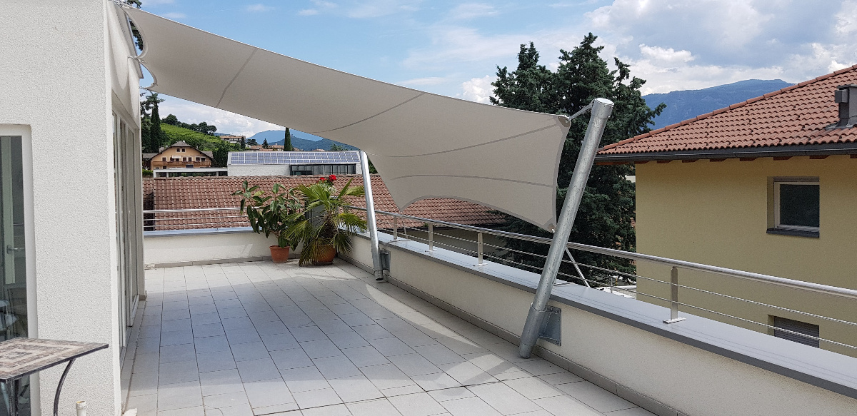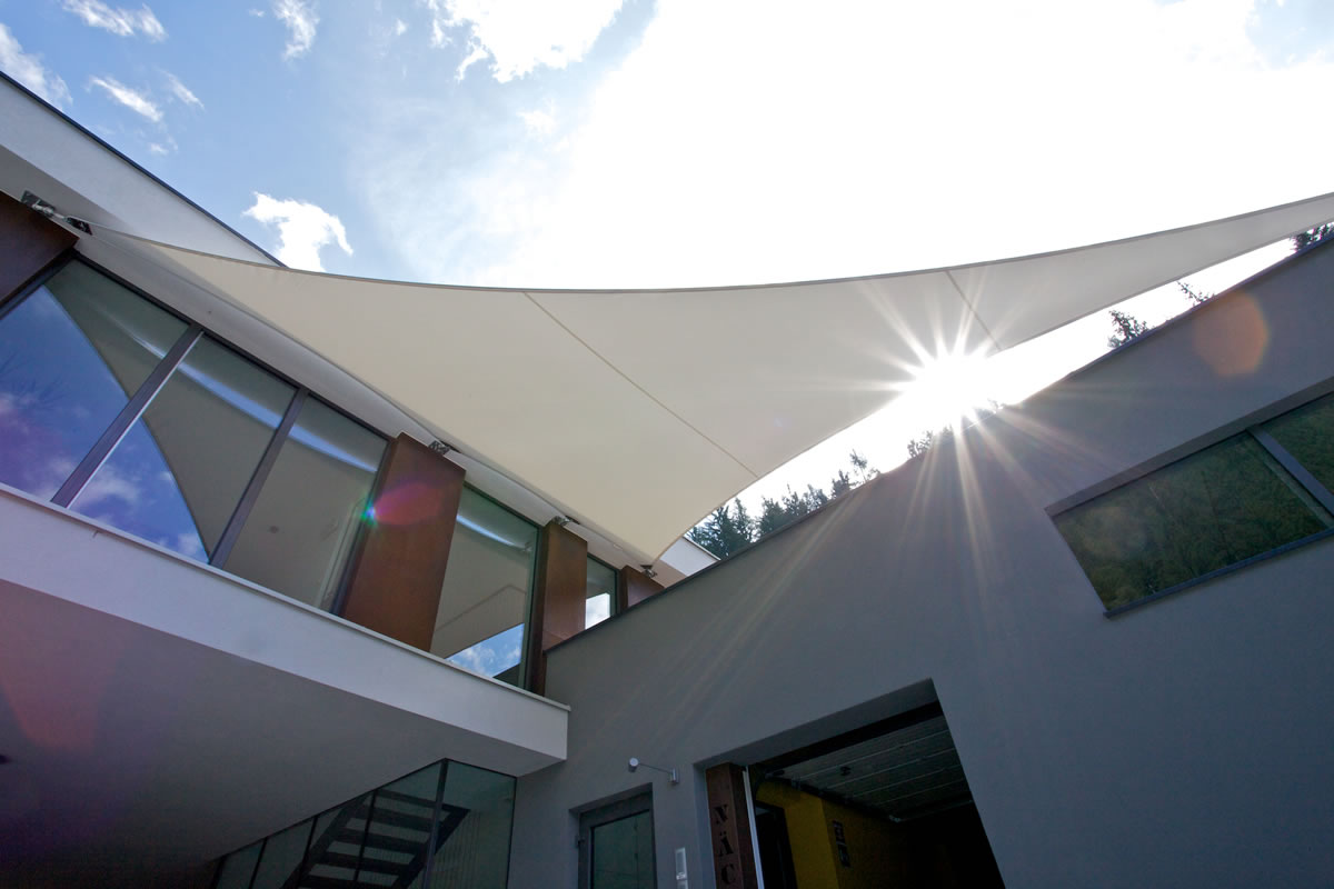 Sonnensegel-Anlagen für den ganzjährigen Einsatz bei Wind und Wetter. Textiler Mambranbau oder auch textile Architektur genannt. Dauerhafter Nutzen in Form architektonischer Highlights zur Beschattung, als Regen- und Schneeschutz. An oder auf Gebäuden oder freistehend als Solitair. In Gärten, als Vordach, als Carport oder sonst als Überdachung. Privat, gewerblich, in Kitas und für die Gastronomie.