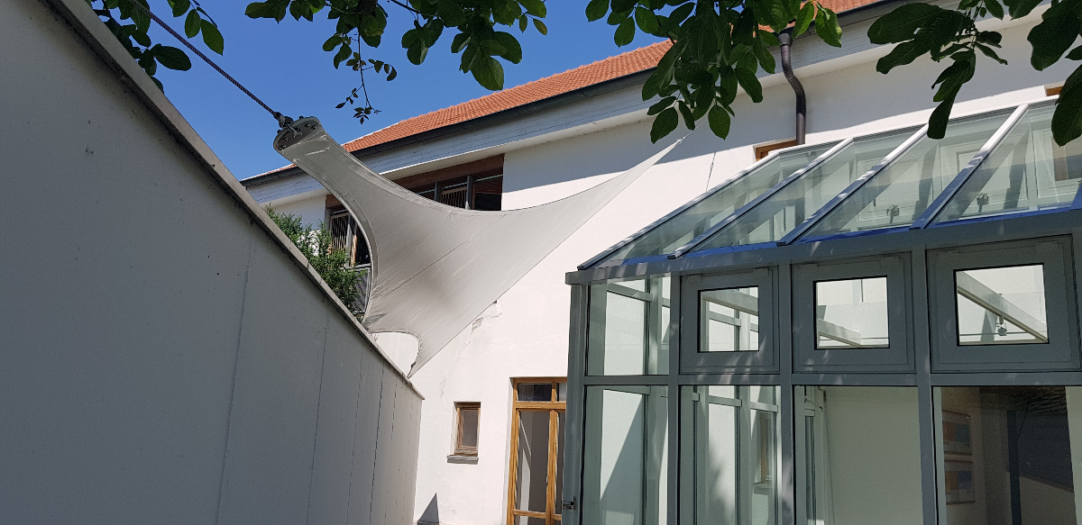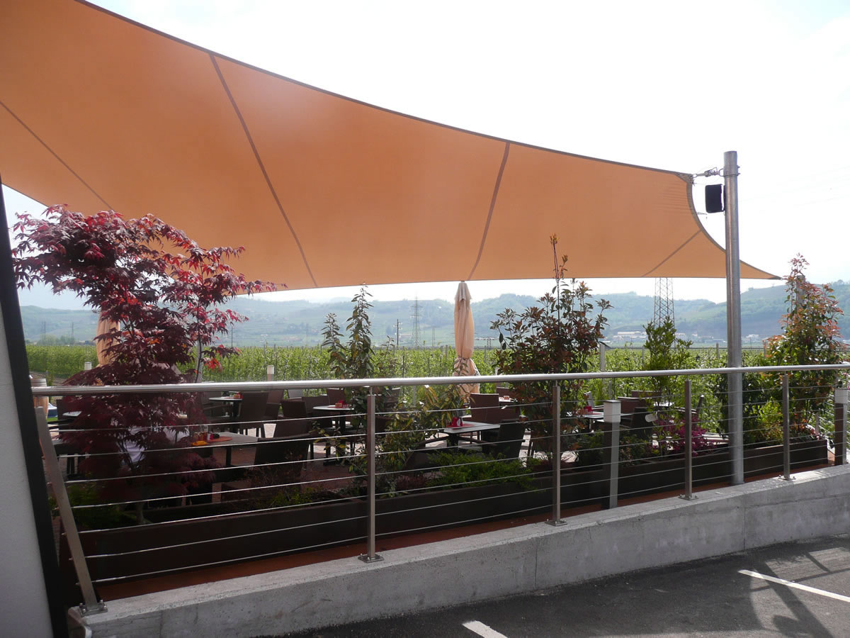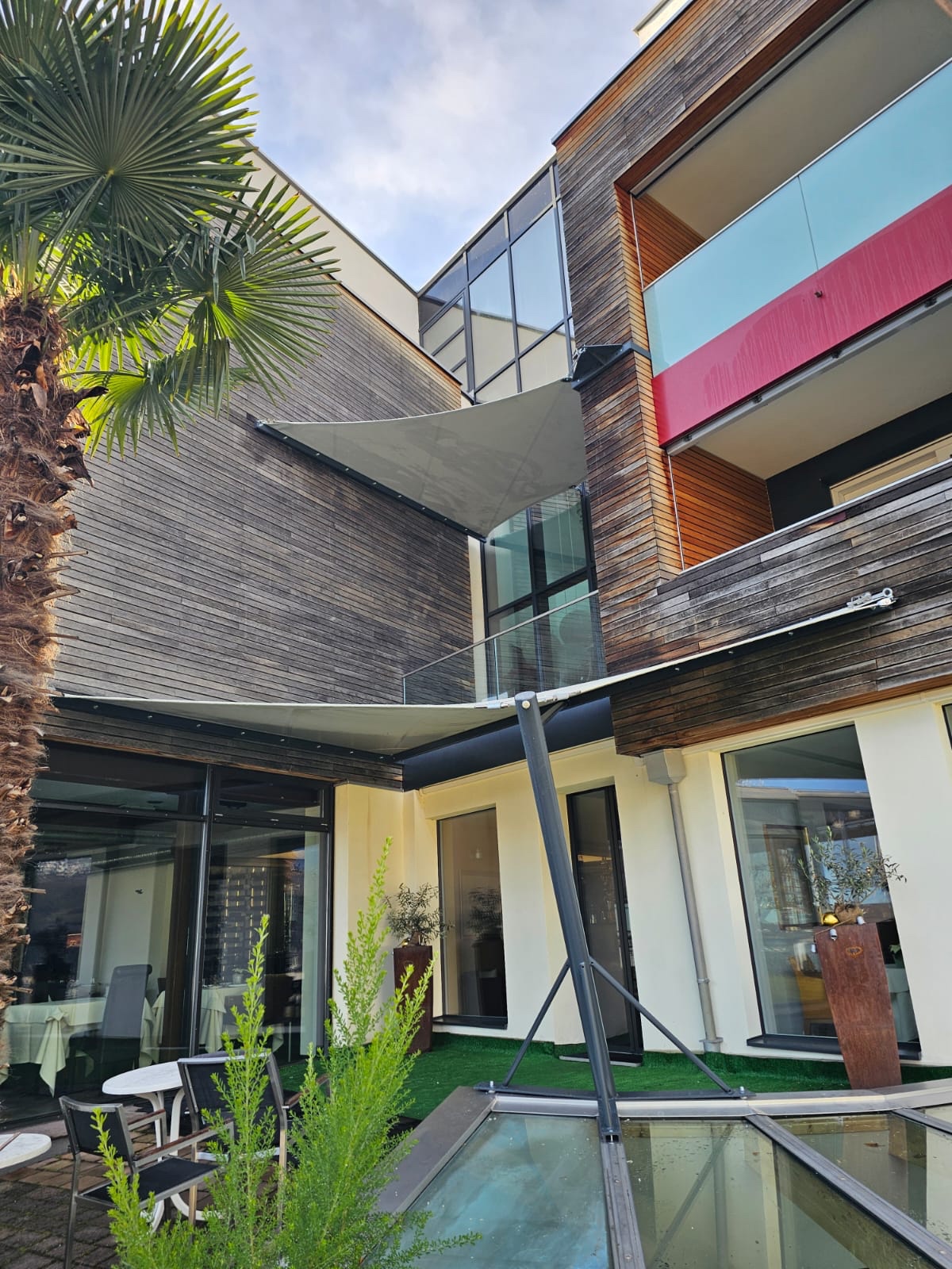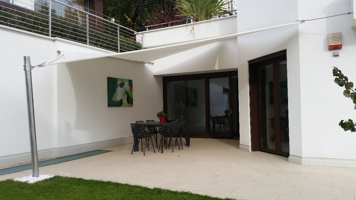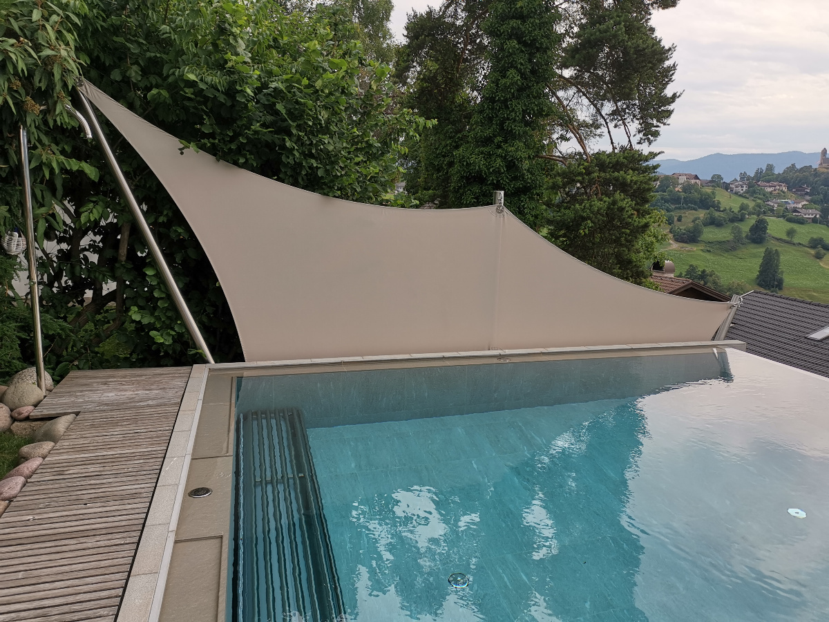 Sonnensegel-Anlagen für den ganzjährigen Einsatz bei Wind und Wetter. Textiler Mambranbau oder auch textile Architektur genannt. Dauerhafter Nutzen in Form architektonischer Highlights zur Beschattung, als Regen- und Schneeschutz. An oder auf Gebäuden oder freistehend als Solitair. In Gärten, als Vordach, als Carport oder sonst als Überdachung. Privat, gewerblich, in Kitas und für die Gastronomie.